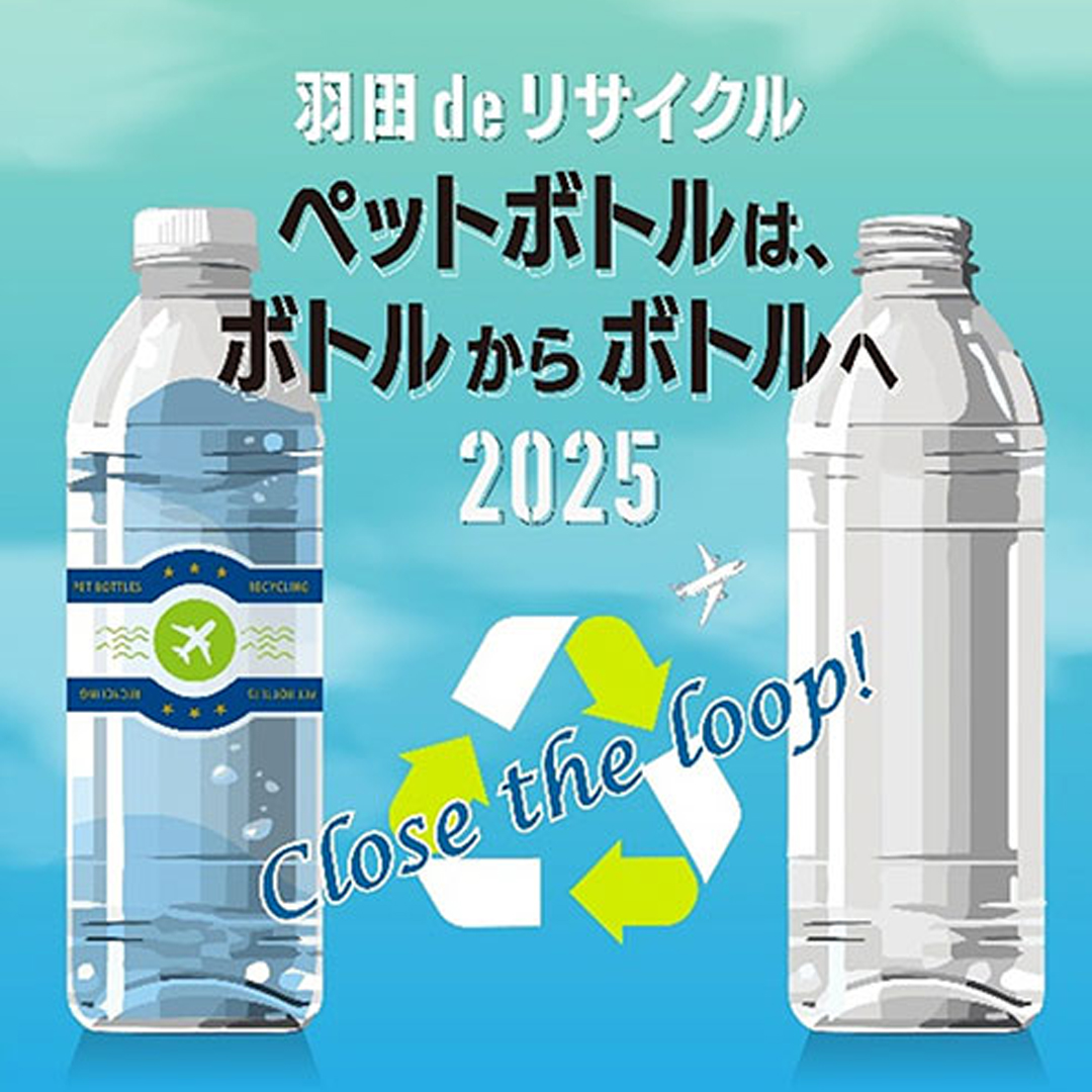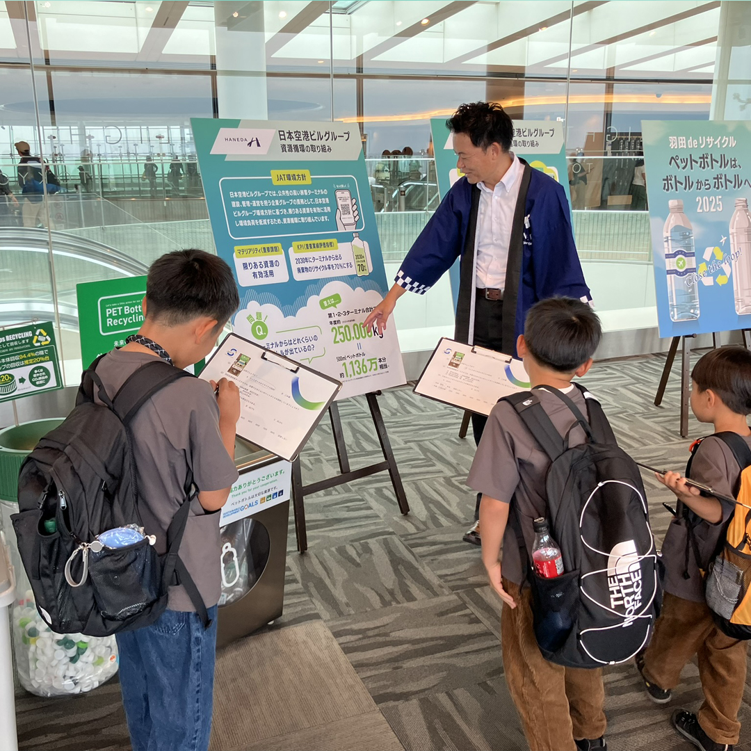 羽田空港において行われた資源循環イベント「羽田deリサイクル ~ペットボトルは、ボトルからボトルへ~(Close the loop!(循環させよう!))。ペットボトル専用回収ボックスの設置や、環境学習講座も開催